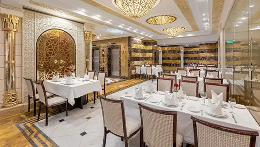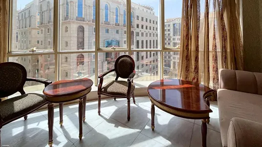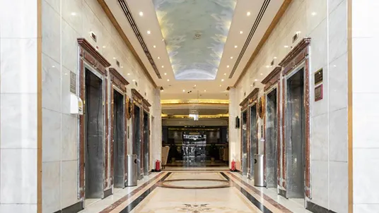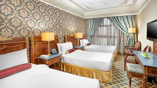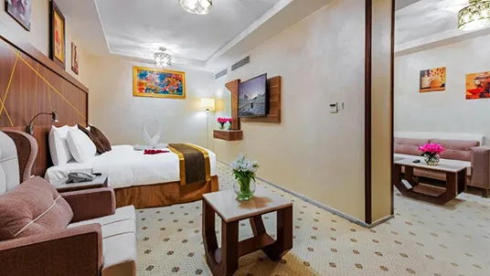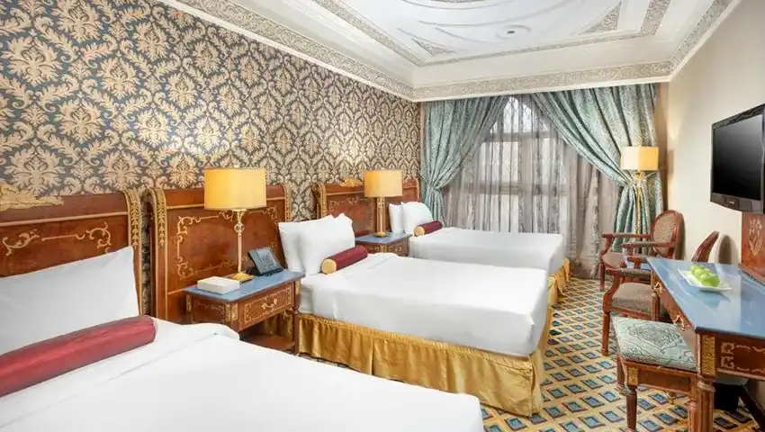 Located on Ibrahim Al Khalil Street, just 800 meters from the Holy Mosque, Palestine Makkah Hotel offers a refined stay in the heart of Makkah. The hotel’s modern 15-story structure features a striking façade adorned with marble and gold-tinted, sun-resistant glass. It houses 445 tastefully furnished rooms and suites, each equipped with a flat-screen TV, satellite channels, air conditioning, a mini refrigerator, and internet connectivity. Guests can enjoy a variety of cuisines at the two buffet-style restaurants on the ground and first floors, or opt for the convenience of in-room dining. The property also includes two large banquet halls with capacity for up to 500 people, along with tailored event packages and accessible parking facilities.