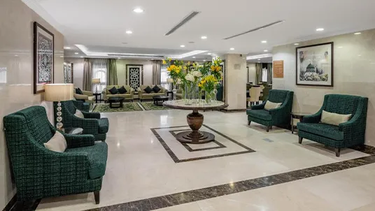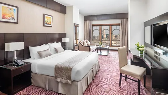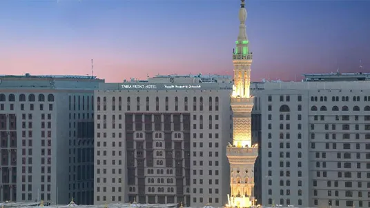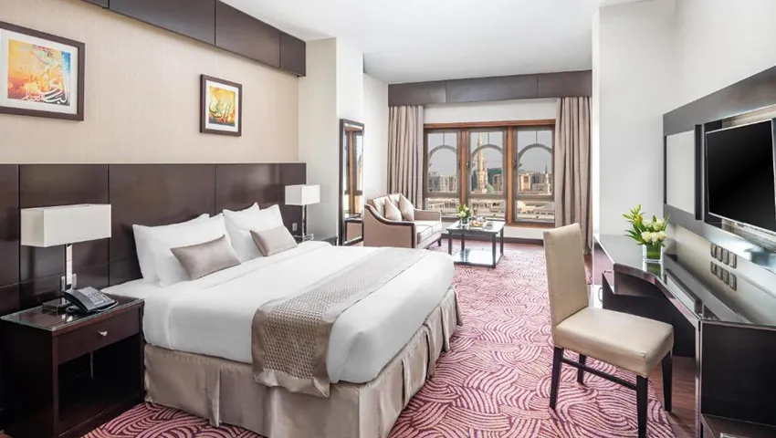 Taiba Front Madinah Hotel is just minutes from the Prophet’s Mosque, featuring modern rooms with scenic views, air conditioning, work desks, and flat-screen TVs. Guests can enjoy complimentary Wi-Fi, 24-hour front desk service, and paid parking when available. The on-site restaurants serve a variety of Arabian and international dishes with stunning views of the Holy Mosque, while the lobby café offers a selection of hot and cold beverages. Room service is available around the clock for added convenience. The hotel also includes a shopping mall and is only a 25-minute drive from Prince Mohammad Bin Abdulaziz International Airport. Couples particularly love the location, giving it a 9.4 rating for a two-person stay.