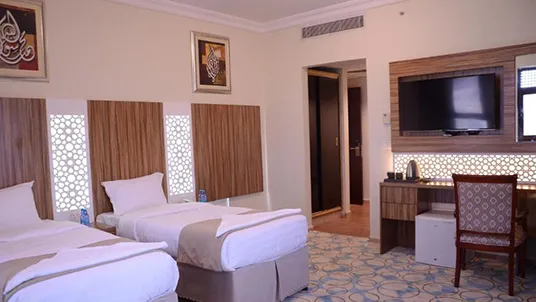 Grand Makkah Hotel, a 5-star property, is popular for its clear views of Al Muallah graveyard and Jabal-e-Noor, and it’s just a 10-minute walk from the Holy Haram. The rooms are modern and comfortable, featuring air conditioning, a flat-screen TV, mini fridge, and coffee and tea facilities, plus dining service for your convenience. With a 24-hour front desk ready to assist, guests can also enjoy the hotel’s Zamzam Café, fitness center, and business center during their stay.