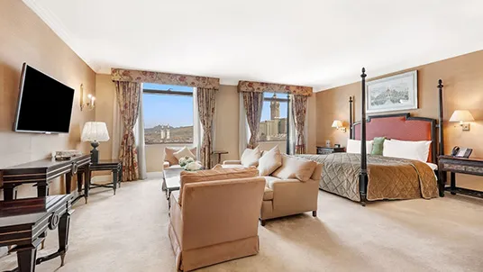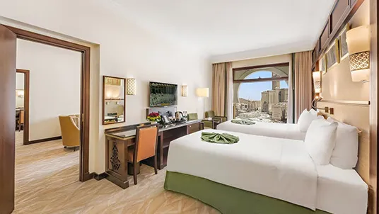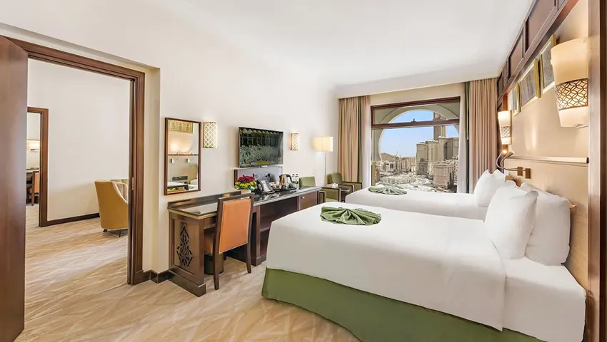 Anjum Hotel Makkah enjoys a prime location just a short walk from the Holy Haram, offering guests breathtaking views of Masjid Al-Haram each morning. This 5-star property provides elegant accommodation, exceptional hospitality, and modern amenities including luxury rooms and daily breakfast. While transport services are not standard, they can be arranged upon request. The hotel’s impressive architectural design adds to the spiritual experience, and guests can select from a variety of room options such as single, classic, or deluxe twin rooms to ensure a comfortable and memorable stay in the sacred city of Makkah.